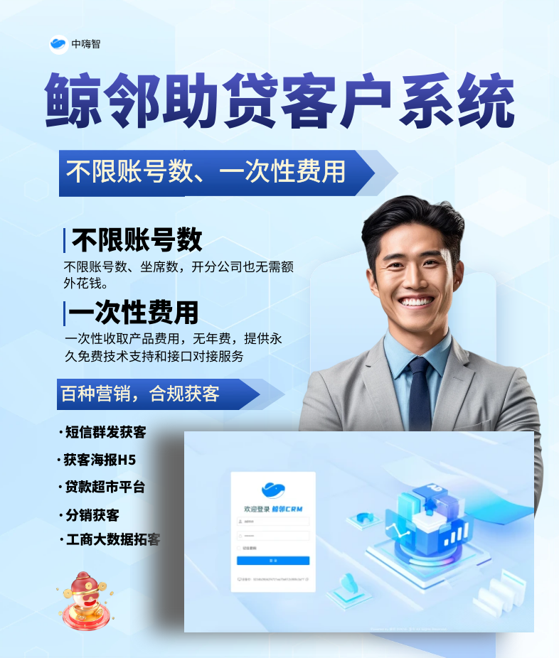 超3000余家企業強烈推薦,鯨鄰助貸CRM系統不限制賬號數,坐席數,支持全系統+數據庫私有化部署,支持對接所有第三方數據平臺和營銷系統,百余種營銷功能,助力助貸企業合規獲客,支持一鍵外呼支持定制開發和交付源碼